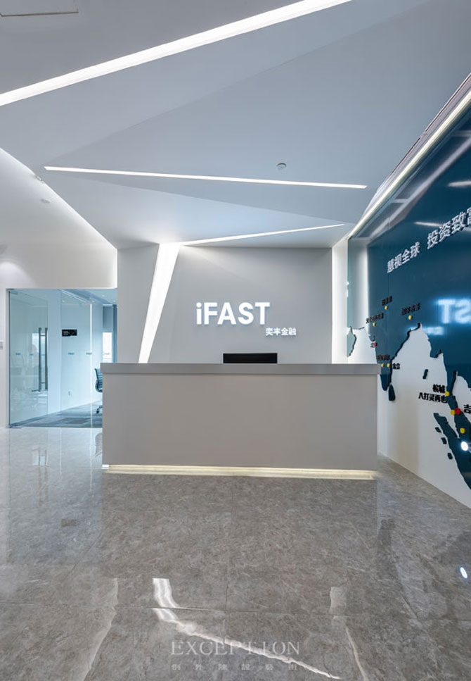 2、前臺(tái)處天花墻面一體鉆石切割面造型,延伸空間的同時(shí)凸顯科技感。