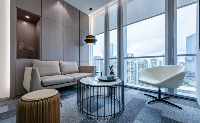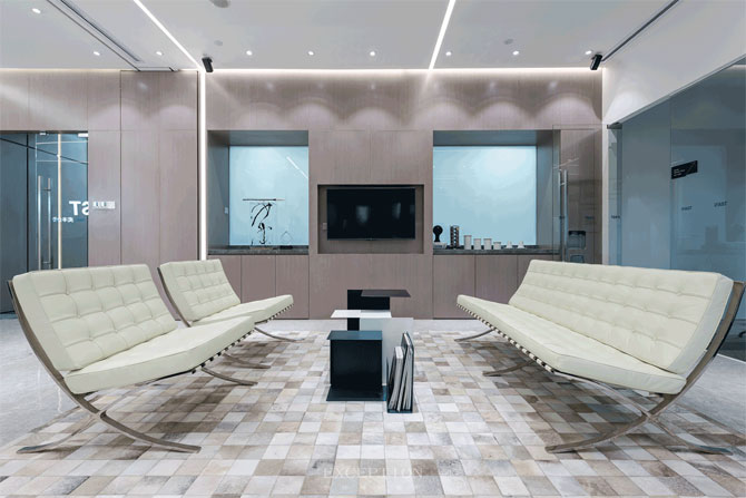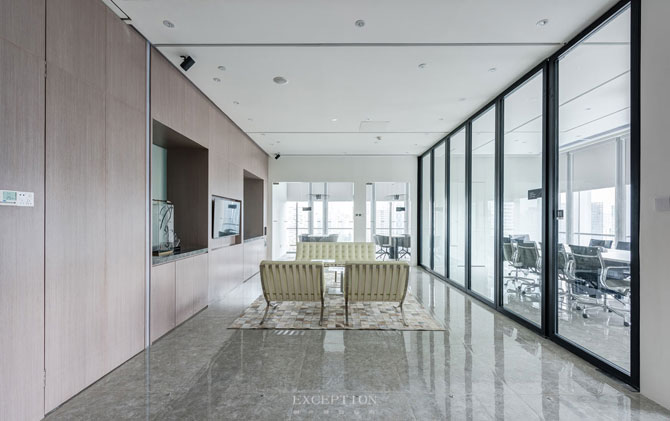 空間的顯與隱有著成百上千種表現(xiàn)形式,而光電玻璃將光、電、玻璃的功能相結(jié)合,展露出透明玻璃與磨砂玻璃不同的視覺體驗(yàn),實(shí)現(xiàn)了會(huì)客區(qū)與辦公區(qū)之間的通透可視與私隱的靈活切換。
