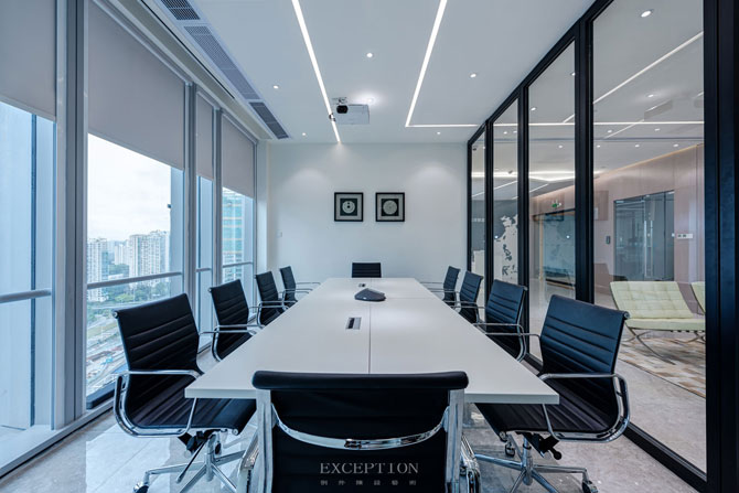 規(guī)整嚴(yán)謹(jǐn)?shù)臅?huì)議空間中,并列而設(shè)的中國(guó)風(fēng)掛畫傾注柔和感性的氣息,黑白鑲邊環(huán)繞無(wú)暇環(huán)佩狀魚飾品,寓意祥和。中國(guó)傳統(tǒng)與現(xiàn)代風(fēng)尚的世紀(jì)邂逅,時(shí)尚雋永。