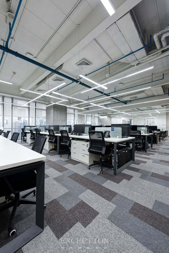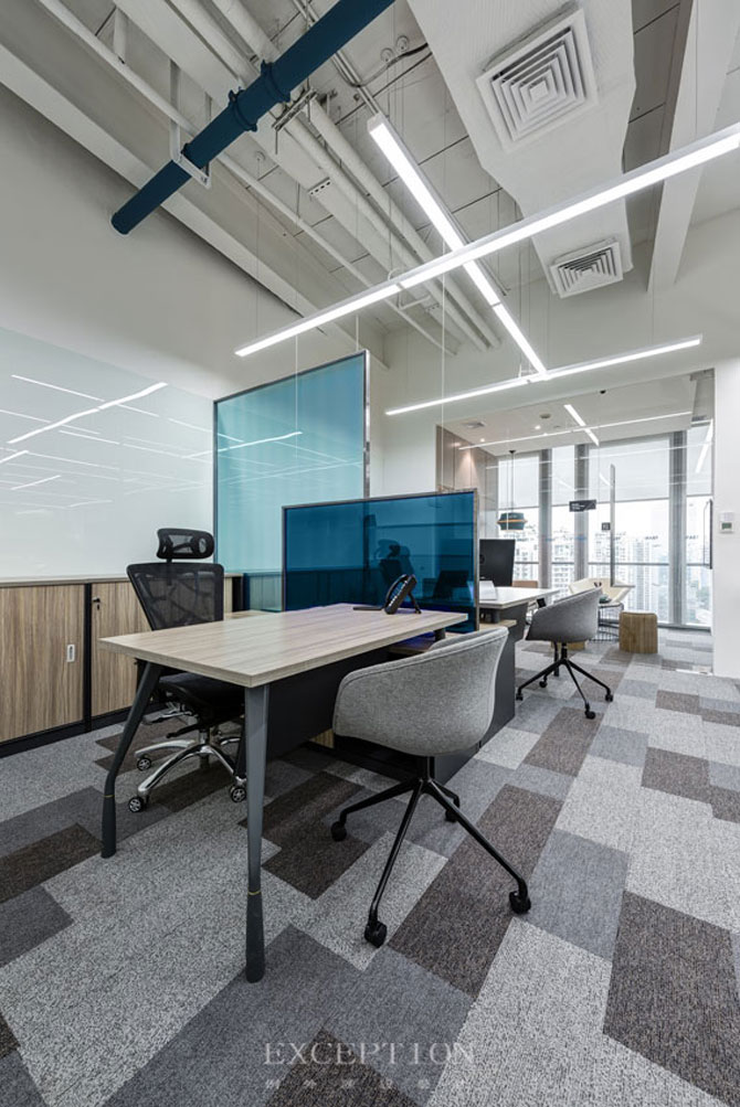 灰、白、咖為主的幾何拼花地毯錯(cuò)落有致,在開放區(qū)無(wú)聲延續(xù)著安靜舒緩,唯恐驚擾認(rèn)真工作的人們。淺藍(lán)和靛藍(lán)雙色玻璃以縱橫排布的姿態(tài)點(diǎn)亮空間的同時(shí)也帶來(lái)鎮(zhèn)定心神的效果。