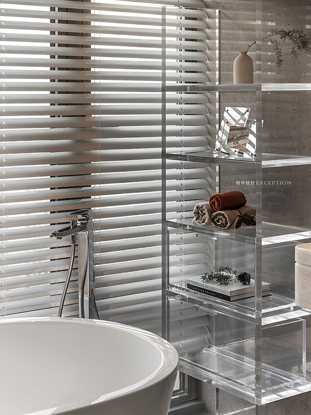 主衛(wèi)以簡(jiǎn)潔清雅為空間基調(diào),亞克力置物架通透實(shí)用,與精品衛(wèi)浴一起彰顯著人性化的設(shè)計(jì)考量。藍(lán)寶石狀大理石塊面作為空間的點(diǎn)睛之筆,似大海的旖旎海浪,天空的無(wú)垠湛藍(lán),百葉窗外一線城景,室內(nèi)水汽氤氳,一首曲調(diào),浪漫而放松,愜意且精巧,種種美好感受都在這里慢慢生發(fā)。