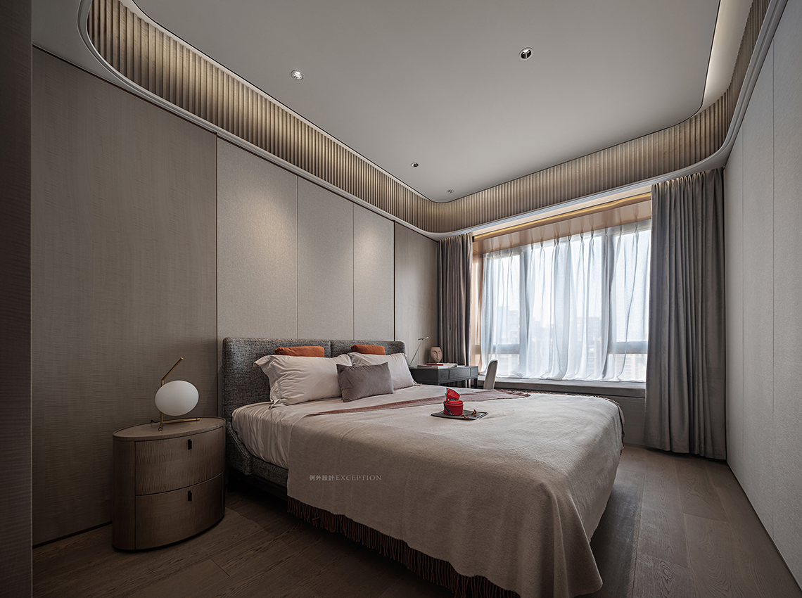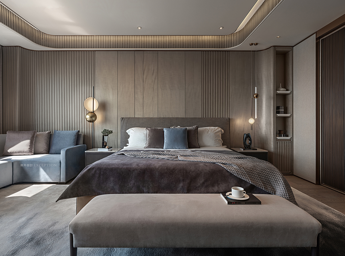 主臥作為套房空間,靜奢而不失生活的藝術(shù)感。方正的格局搭配圓弧形轉(zhuǎn)角沙發(fā),為私域空間增加了豐富的生活場(chǎng)景。不規(guī)則金屬吊燈錯(cuò)落有致,將空間的品質(zhì)感再次提升。