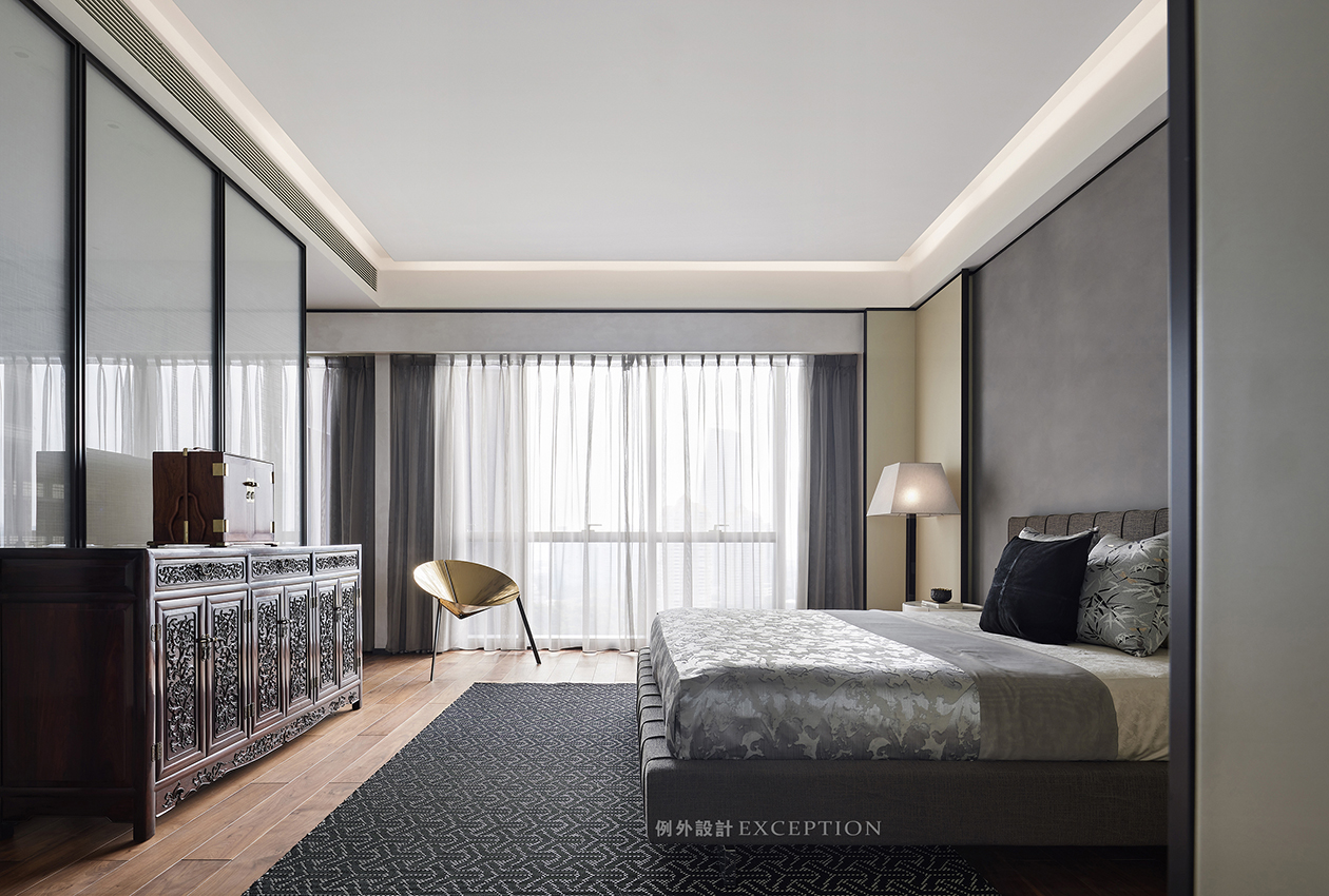 主臥套房以半通透屏風(fēng)開啟歲月靜好的休憩畫面,空間錯落有致。設(shè)計將原有的兩房打通,屏風(fēng)前是男業(yè)主的私人天地,安靜辦公、潑墨揮毫、研究家具歷史,每一天都內(nèi)心豐盈而曠達。