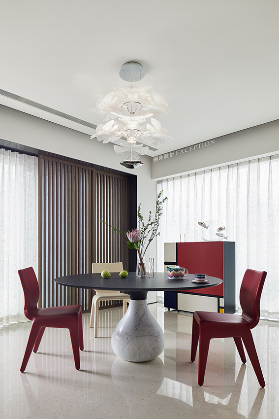 蒙德里安經(jīng)典的紅黃藍(lán)白元素融入餐邊柜的創(chuàng)意中,成為餐廳一隅的經(jīng)典。紅白相配的皮質(zhì)餐椅圍合黑白拼接的水滴形餐桌,豐富了家人三餐四時(shí)的藝術(shù)享受。雅白花朵吊燈更是將這一氛圍烘托得更加濃郁、澄澈。格柵屏風(fēng)朦朧中透露詩意,空間強(qiáng)烈的色彩所調(diào)和的韻律感,成為讓人深情迷戀的所在。