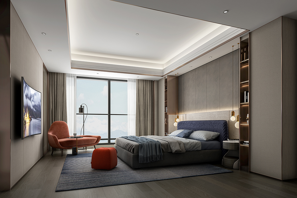 主臥在原有硬裝的基礎(chǔ)上增加了收納柜,可以隨手拿取喜歡的書(shū)籍,也可以珍藏世界各地旅行的回憶。增加了生活情調(diào)的同時(shí),也慢慢發(fā)現(xiàn)更好的彼此。金屬與棉麻的配搭,藍(lán)色與橙色的碰撞,抬眼望向窗外的那一刻,室內(nèi)的奢雅與自然的靜美達(dá)到了平衡舒適的境地。