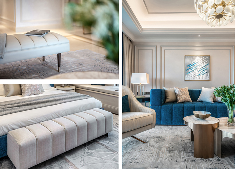 家私上選取絨布、皮革、布藝等面料,細(xì)膩親膚,凸顯之感。家具上融入金屬元素,增加時尚、精致的感覺。