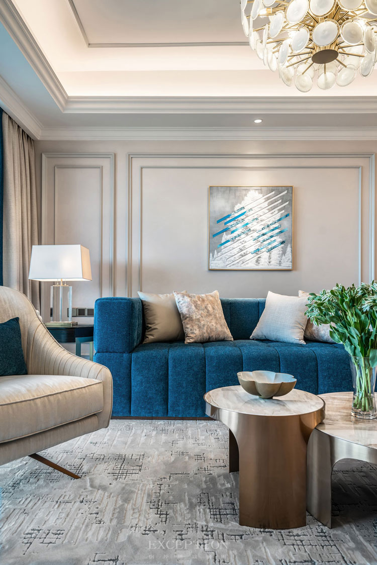 客廳布局開闊明亮,所有的線條簡約而規(guī)整,克制且必須?;野椎牡驼{(diào)讓渡出更多的視覺焦點(diǎn)以承載孔雀藍(lán)的高貴,訴說著一種精致清雅的存在。