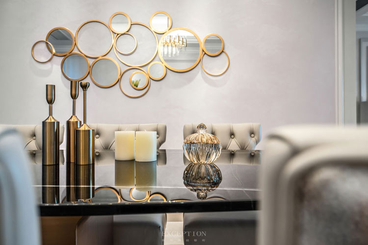 恰到好處的金屬元素引導(dǎo)出時尚雅奢的韻味,水晶燈灑下的星輝在餐廳一隅悄然綻放光華。清麗淡雅的花束陪伴著和樂溫馨的就餐體驗(yàn)。空間的陳設(shè)與所散發(fā)的氣質(zhì)與居者是相互影響的關(guān)系,居者的品位賦予物以靈魂,而物品反過來也會影響人的心情,甚至是幫助他們找尋到自己真正所追求和熱愛的東西。