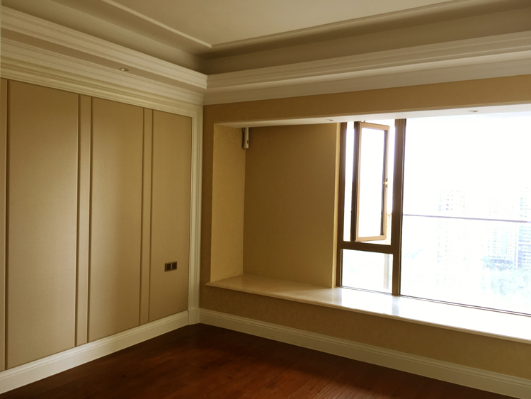 3、兒童房飄窗在原有基礎(chǔ)上設(shè)計了儲藏柜,增加了收納功能。同時用純色的藝術(shù)涂料取代了不太和諧的墻面硬包。