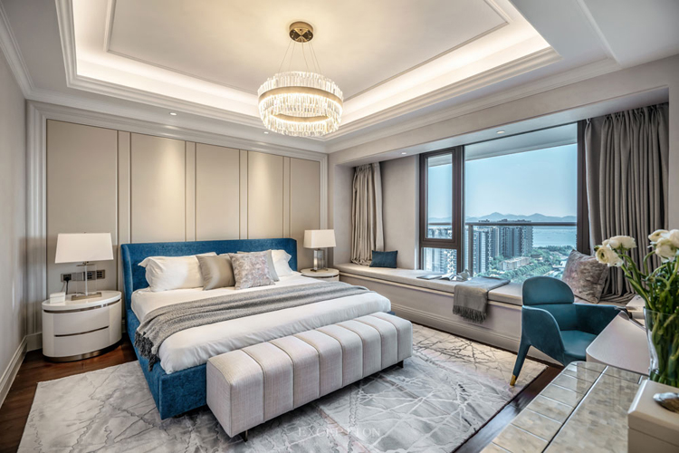 謐靜舒適的藍(lán)延續(xù)到主臥,與一襲素色床品不期而遇,不喧嘩卻獨(dú)具格調(diào),恰如藝術(shù)與生活的完美邂逅。設(shè)計將生活的質(zhì)感美學(xué)毫無保留地呈敬,貝殼白邊柜閃耀星星點(diǎn)點(diǎn)的光暈,訴說著愜意舒朗的生活情狀,個性圓鏡映照出伊人純真的模樣,窗外城景入畫,豐盛室內(nèi)精彩生活。