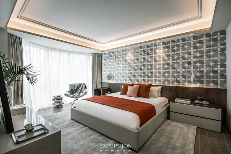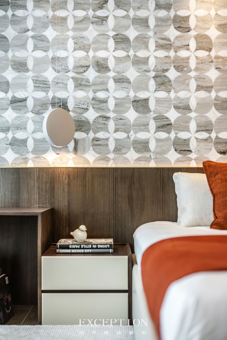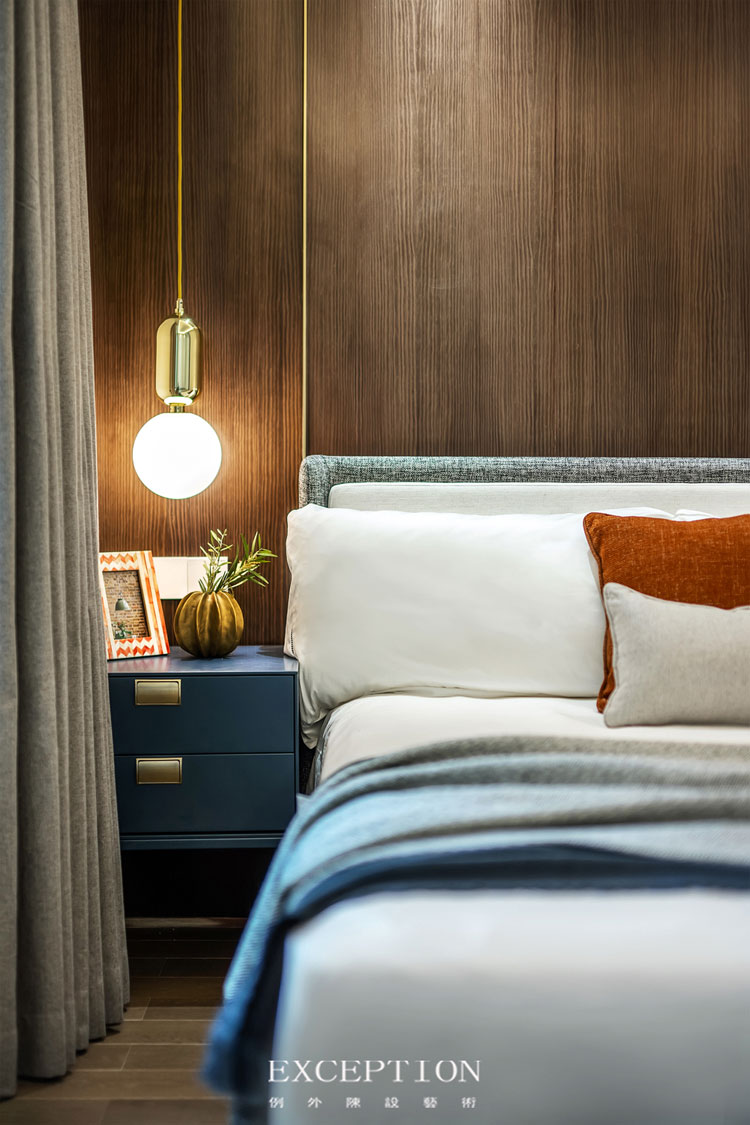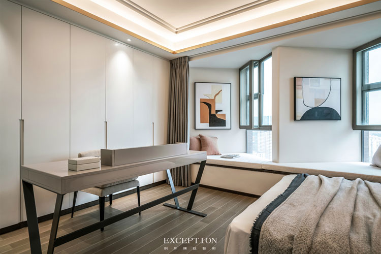 主臥繼續(xù)回歸靜謐淡雅的路線,閑時(shí)可引清風(fēng)作伴,以書為媒去探求未知的精神境界。窗邊床頭背景,延續(xù)客廳的紋飾,重疊往復(fù),似一首經(jīng)典曲調(diào)的副歌部分,在一遍又一遍之中找尋到空間的韻律感。床頭柜拒絕了對(duì)稱的展示,而是定制大小不一的柜體讓空間得到合理的利用,線條利落而干凈,牽引出最個(gè)性的空間氛圍。