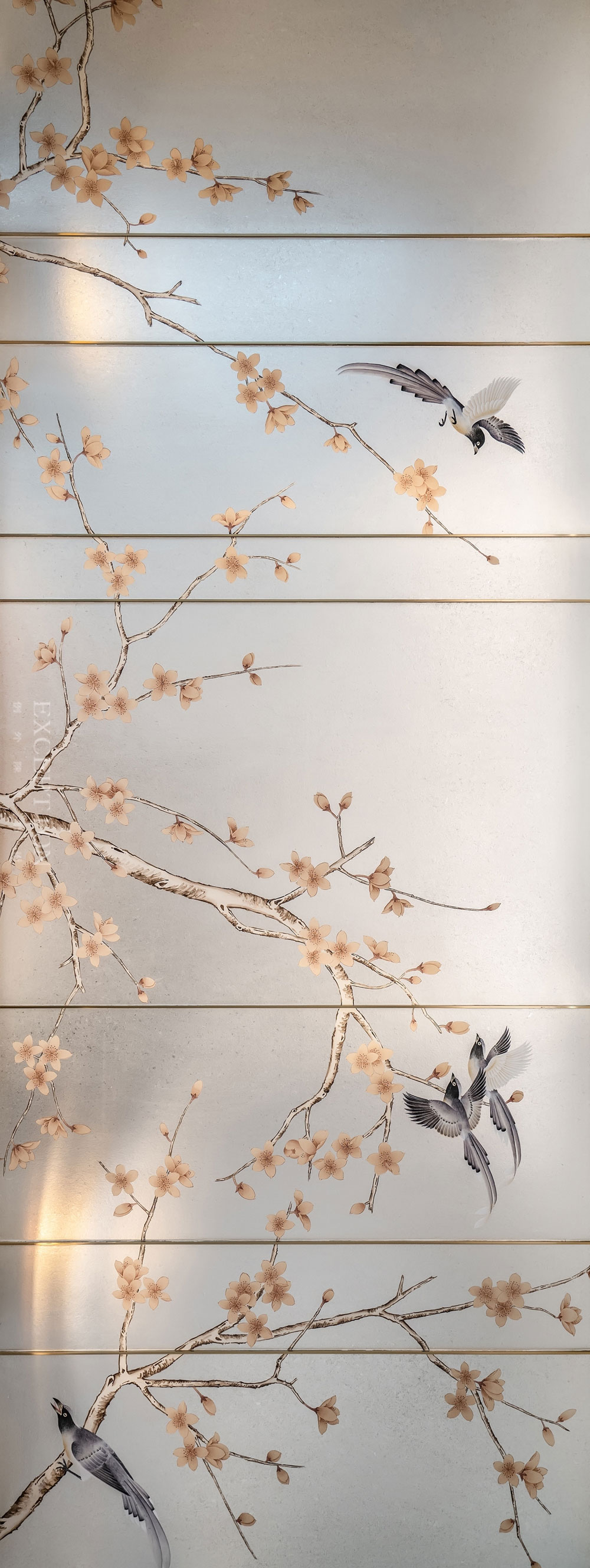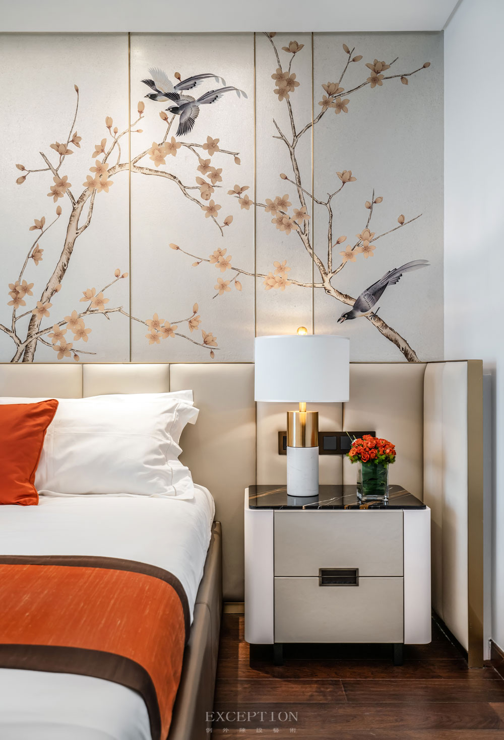 猶如一支曲子的高潮部分,花開滿枝頭,雀鳥盼人歸。傳統(tǒng)的花鳥悠閑地在銀箔材質(zhì)的背景墻上縱情盛開、歌唱,與同色系的床品不謀而合,明麗爛漫。每一處細(xì)節(jié)都在展示對(duì)理想生活的美好期待。