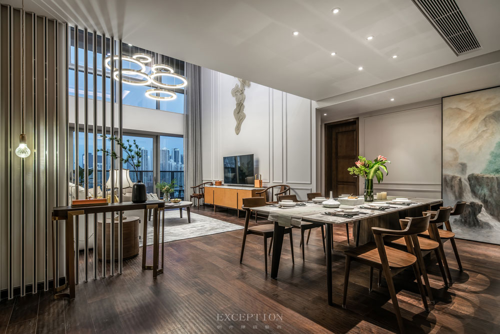 開放式客餐廳的布局,留給居者更多的互動(dòng)空間。大理石、鋼木材質(zhì)、格柵的搭配加上禪意十足的擺件,傳統(tǒng)與現(xiàn)代在此達(dá)成了完美的和解。晨起日光和煦,夜間月色朦朧,有花香盈懷,任松風(fēng)颯颯,食光微甜,人間無(wú)恙。