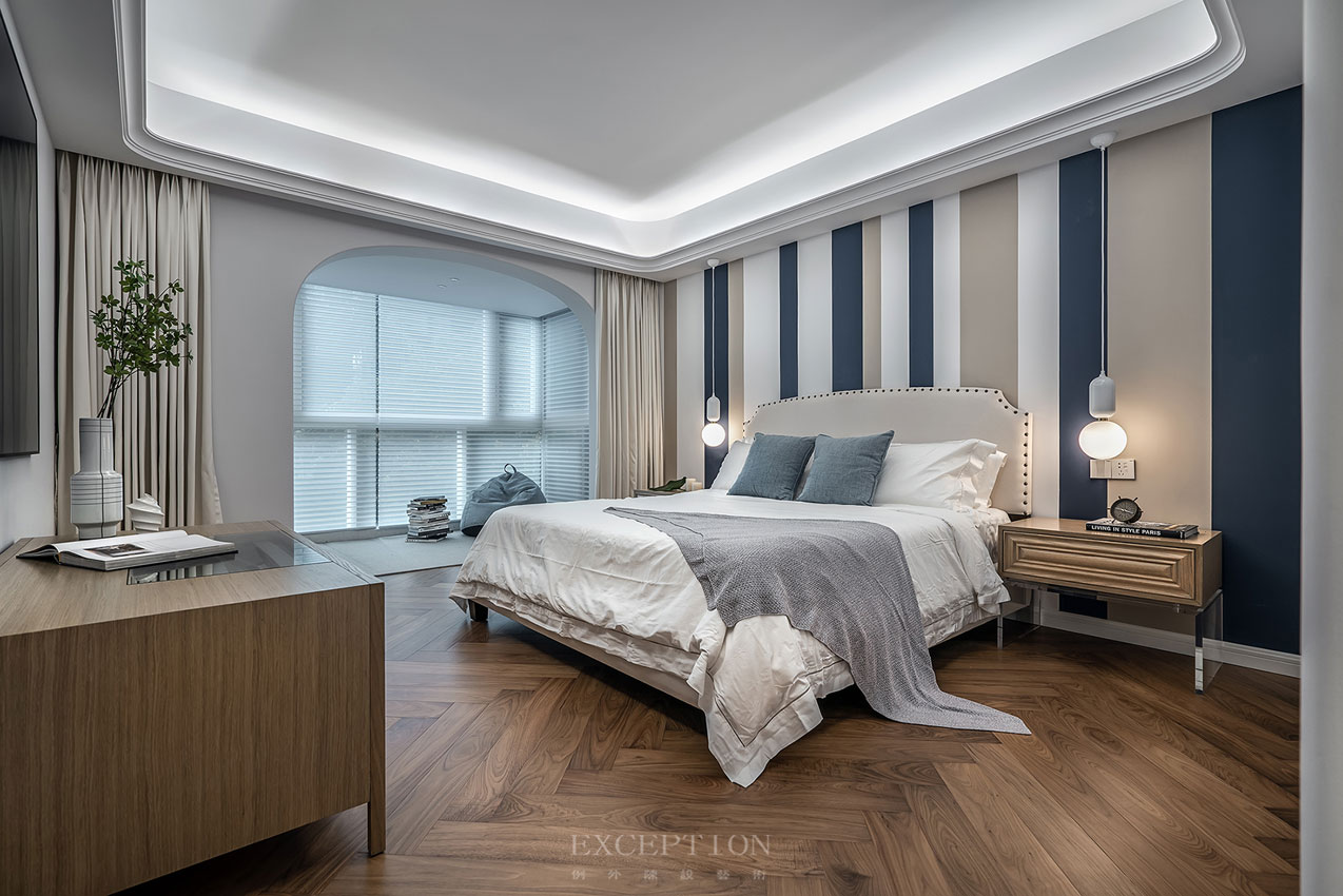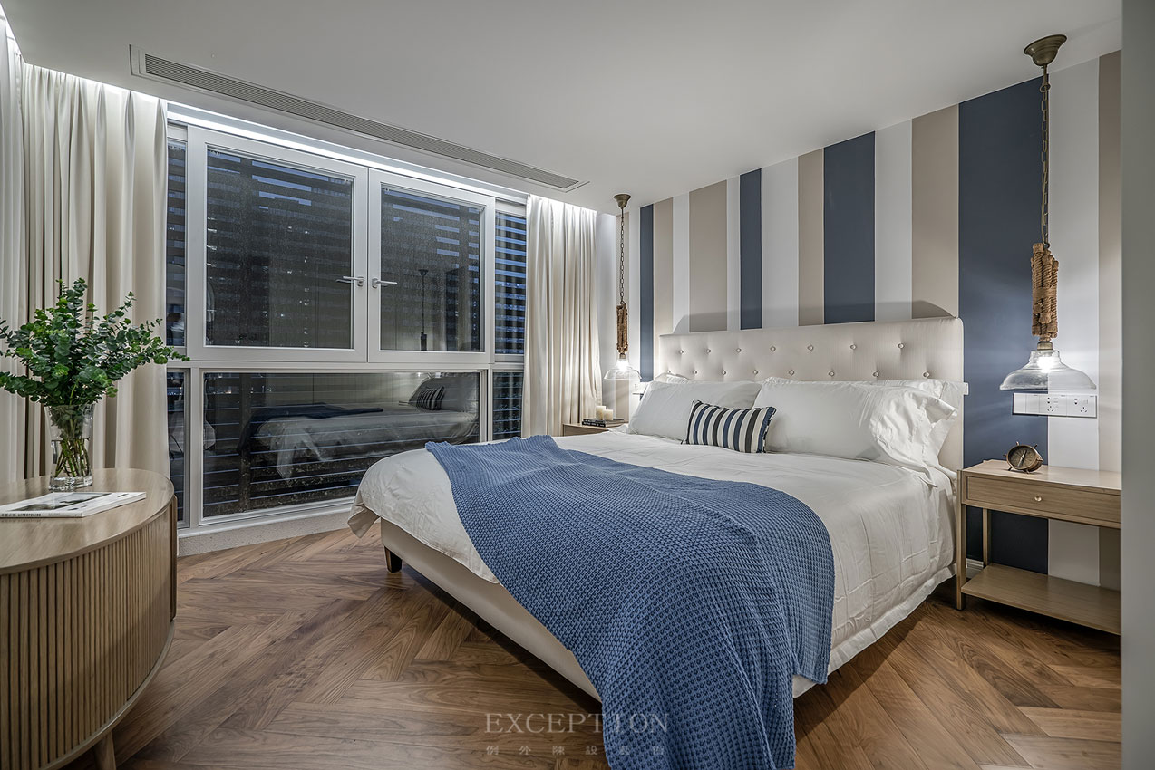 在主臥,我們主要是要營造一種休閑隨性的氛圍,藍白相間的條紋背景將海邊的愜意囊括進來,隨意搭在一旁的搭毯則將這份隨性與舒適具象開來。