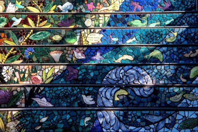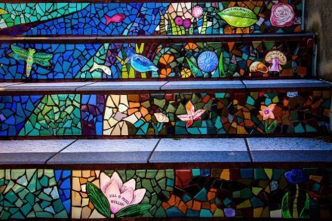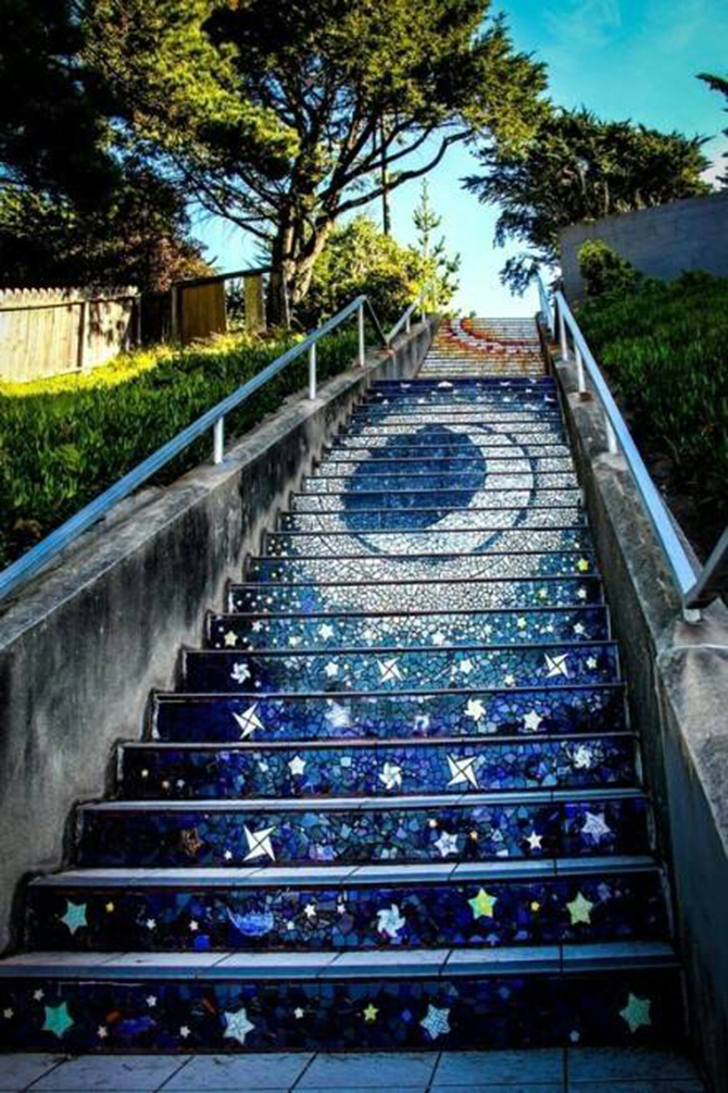 Mosaic Stairs共有163級(jí)臺(tái)階,呈35度左右的斜坡向上延伸,這件偉大的藝術(shù)作品由愛(ài)爾蘭陶藝大師Aileen Barr和舊金山馬賽克藝術(shù)家Colette Crutcher共同設(shè)計(jì),使用超過(guò)2,000塊手工制作的瓷磚與75,000塊瓷磚碎片、鏡片與彩色玻璃,帶領(lǐng)超過(guò)300名市民花費(fèi)兩年半時(shí)間完成,純手工鋪砌,制作精美,描繪了一個(gè)從海底世界到日月星辰的夢(mèng)幻場(chǎng)景。