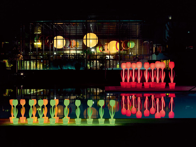 而XL型Tulip Lamp適用范圍更大,花園里、泳池邊都是不錯(cuò)的選擇,此外還可以通過(guò)遙控器調(diào)整光色、亮度。XL版本的一大亮點(diǎn)是采用了LED,保證了低功耗,一個(gè)光輸出保證了精確的亮度優(yōu)化,同時(shí)可用腳開(kāi)關(guān)體現(xiàn)了人性化的考量。當(dāng)然,設(shè)計(jì)師也考慮到它可能因?yàn)轱L(fēng)大而被吹倒,XL版本采用了氯丁橡膠電纜進(jìn)行地板緊固,完全打消了用戶(hù)的顧慮。屆時(shí),夜幕降臨時(shí)只需安心享受舒適浪漫的郁金香燈光派對(duì)了。