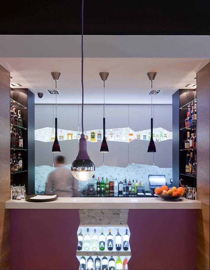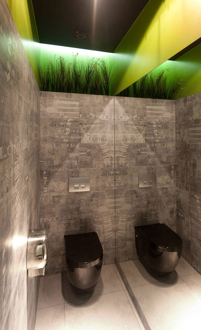 餐桌使用天然橡木打造成簡明利落的現(xiàn)代風格,原木色和白色構(gòu)成了整個就餐區(qū)的主色調(diào)。休息室內(nèi)不僅有報紙裝飾,還有印著很多城市名字的灰色巖石瓦片。在衛(wèi)生間的裝飾中,設(shè)計師用玫粉來裝飾女士洗手間,用石灰綠來裝飾男士洗手間。隨處可見擺放的綠植,使得餐廳的整體氣氛更加優(yōu)雅且富有活力。
