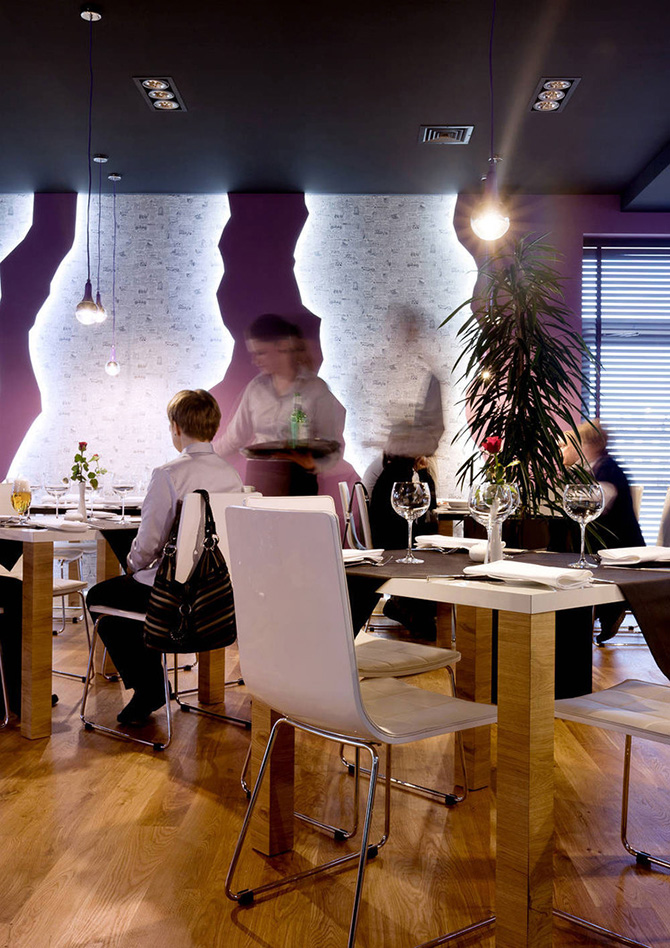 一個優(yōu)雅的就餐環(huán)境往往能為我們促進食欲,胃口大開。英國的酒店大師、心理學家羅非曾做過一項統(tǒng)計:85%的人在就餐時是沖著環(huán)境選擇的,也有63.5%的消費者在滿意就餐環(huán)境時作出超出原先預(yù)定消費額的決定。因此就餐環(huán)境對食客的影響顯而易見。在波蘭特切夫市,有這樣一間Hot Paper Restaurant,墻面裝飾紳士別致,創(chuàng)意非凡,舒適的室內(nèi)陳設(shè)配上獨特的照明方案,為食客們營造出一種溫馨的就餐氛圍。