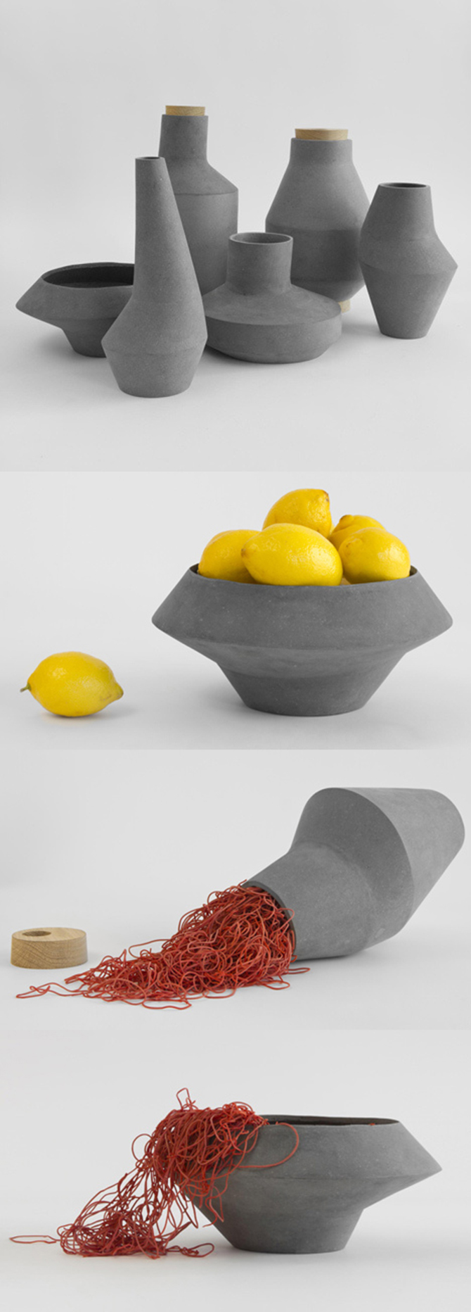 隨機寫意的造型,毫無修飾的平滑外觀,類似清水混凝土的表達形式,顯示出一種回歸本質(zhì)的美感,樸實無華、自然沉穩(wěn)的外觀韻味與生俱來的厚重與清雅體現(xiàn)的是“素面朝天”的品位,看似簡單,實際上比繁復華麗更具藝術(shù)效果?;疑貎?,所以鮮明的對比之下,顯得花朵、蔬果更加色彩明艷