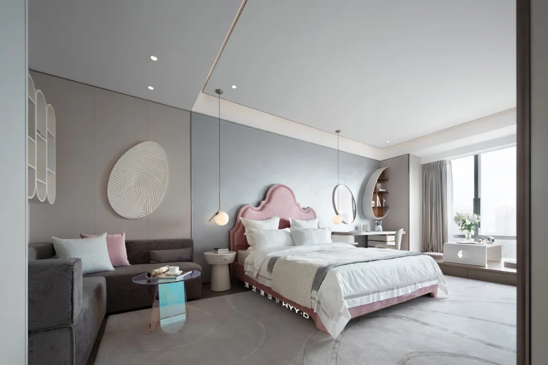 從踏入房間的那一刻起,腦海里便浮現(xiàn)了多功能的生活場景,視線和思緒都變得柔軟起來。軟飾上選用象牙白、浪漫粉、月光灰,融入幾何美學(xué),彰顯女孩的柔美爛漫,讓人如沐春風(fēng),閨蜜小聚、閱讀閑聊,觀景休憩,功能和情感之外,設(shè)計創(chuàng)造了額外的思考空間陪伴成長。