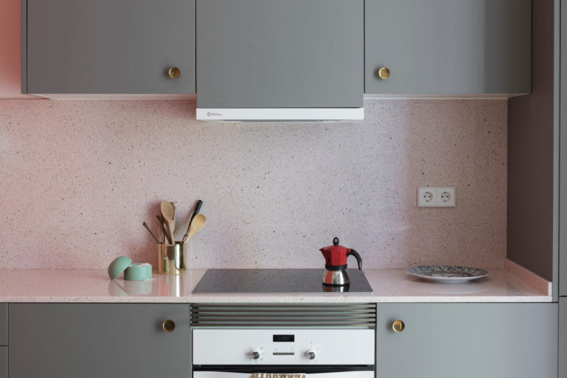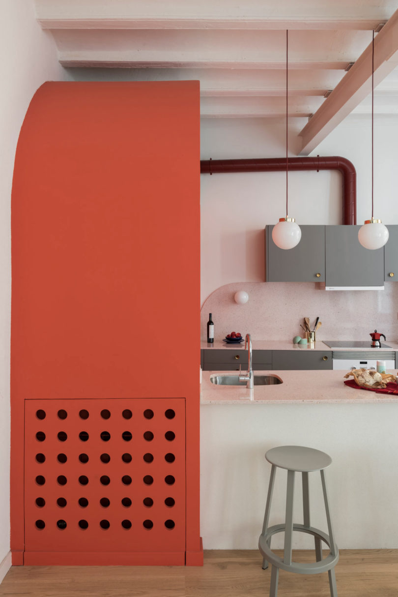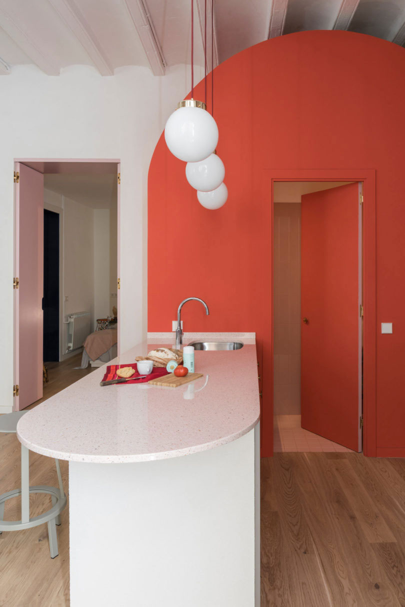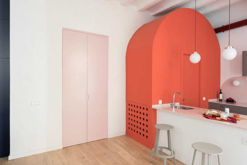 由于建筑本身具有大量的拱形元素,于是設(shè)計師在室內(nèi)添加了許多的拱形元素。例如天花和衛(wèi)生間,最吸睛的其實(shí)還是俏皮的空間配色??臻g以定制的新家具進(jìn)行呼應(yīng),加強(qiáng)新與舊的聯(lián)系。