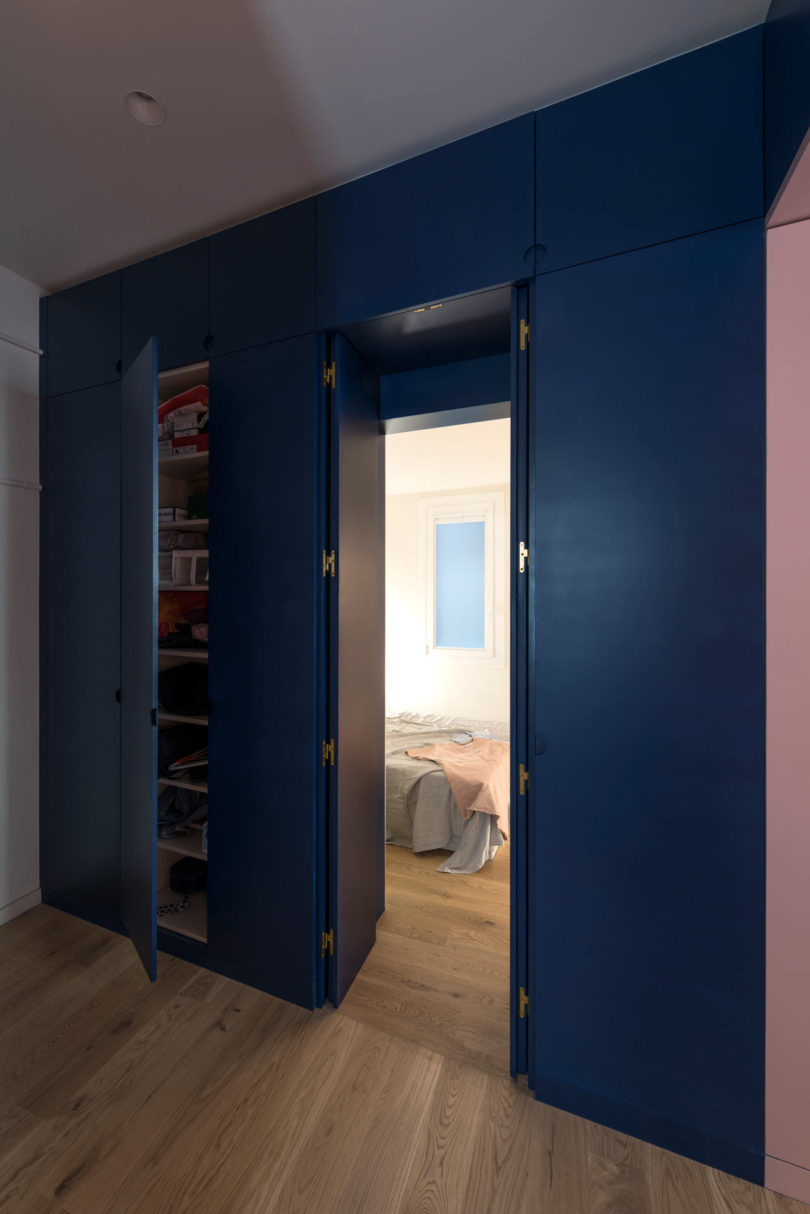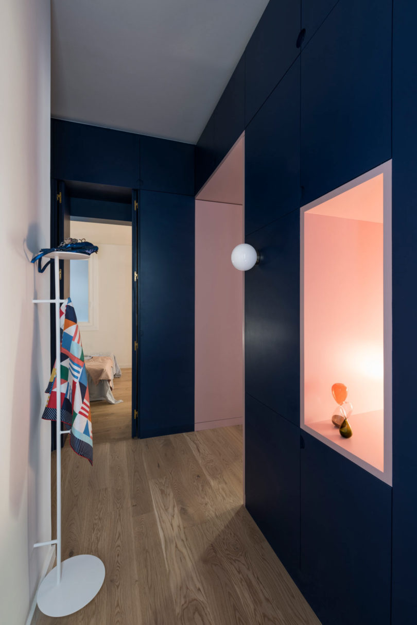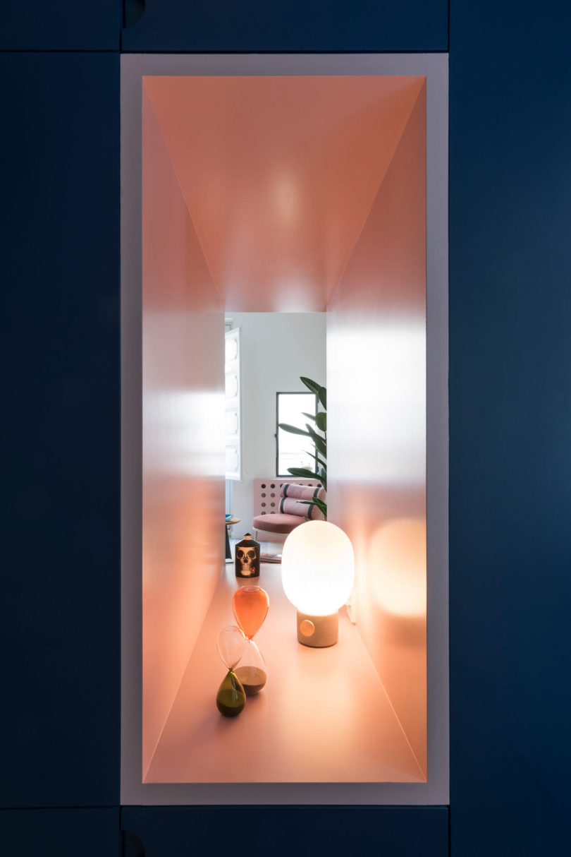 老建筑原有的采光不佳,為了增加采光,設(shè)計師做了許多有趣的改變,除了在外墻開設(shè)門窗外,作為隔斷的柜體也被做出了通透的壁龕,擺放一盞燈,讓燈光與自然光線點(diǎn)亮原本昏暗的過道。