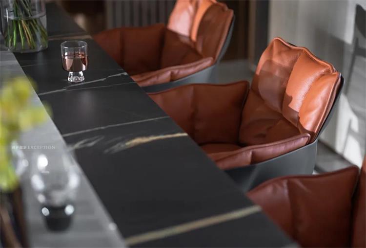餐廳在延續(xù)整體的朗闊格局后,以不同的形式實(shí)現(xiàn)生活的分區(qū),繁星點(diǎn)點(diǎn)的吊燈是自在暢游的魚,左邊圓月掛件端然靜謐,右側(cè)水墨理石紋理縱橫飄逸,椅面上柔和穩(wěn)重的棕紅,是端然中一絲不羈的時(shí)尚,隨性而不乏精致與家的溫度。